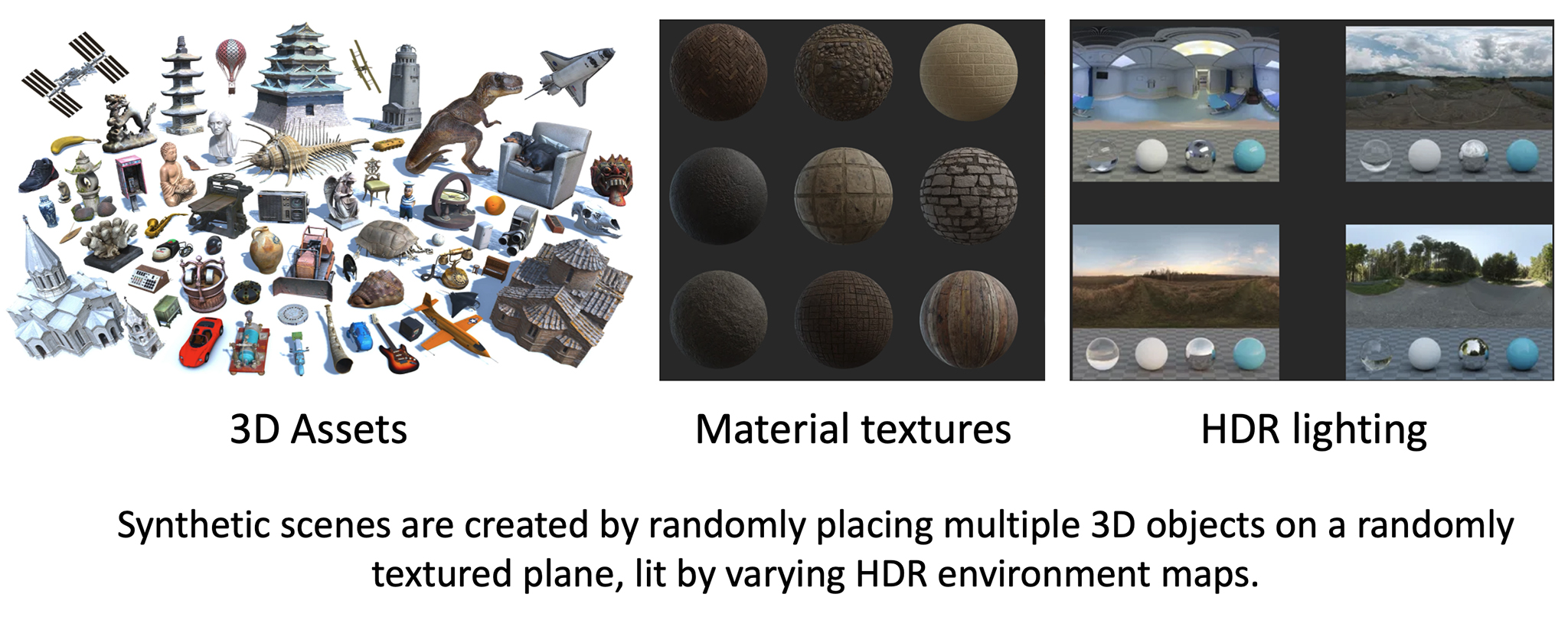平面上に複数の3Dオブジェクトを配置し、BlenderのCyclesでレンダリングして合成画像データセットを生成します。このパイプラインは、オブジェクトのランダム配置、マテリアル、HDRI環境ライティング、数種類のカメラ/ライトのモーションモードをサポートしています。