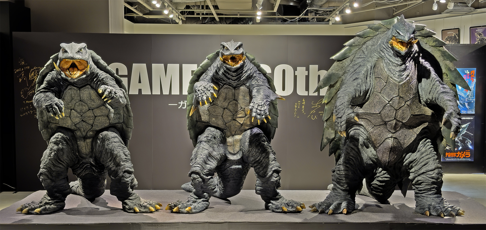 過去3回のクラウドファンディングで復元された平成ガメラ3体が揃い踏み。