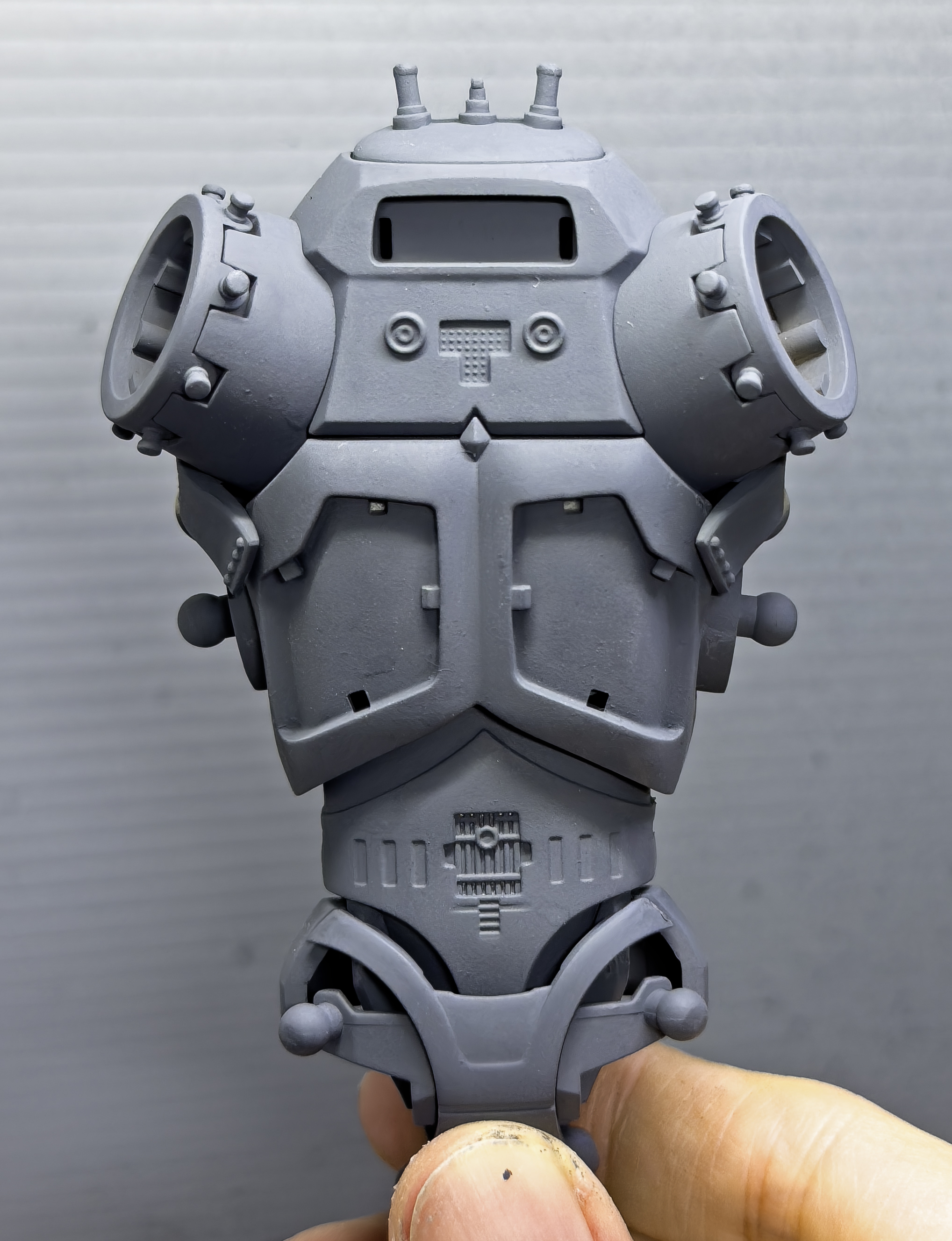 グレーを吹いてみると、パーティングラインや合わせ目、傷などがまだ残っていたので、ヤスリがけして部分的にベースグレーを溶パテ代わりに少し厚めに筆塗りし、乾いてからまたサンドペーパーで均した↓